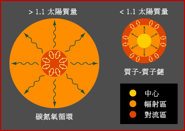 碳 氮 氧 循 環 的 反 應 比 較 快 , 可 以 產 生 更 多 能 量 ﹐ 而 只 有 對 流 核 心 能 將 這 些 多 的 能 量 有 效 地 傳 遞 出 去 。 在 這 些 星 體 較 外 層 的 氣 體 仍 然 很 熱 和 比 較 透 明 ﹐ 所 以 輻 射 傳 播 是 一 每 個 有 效 的 傳 遞 方 法 ﹐ 結 果 是 ﹐ 這 些 恆 星 會 有 一 個 對 流 核 心 和 輻 射 外 殼 。