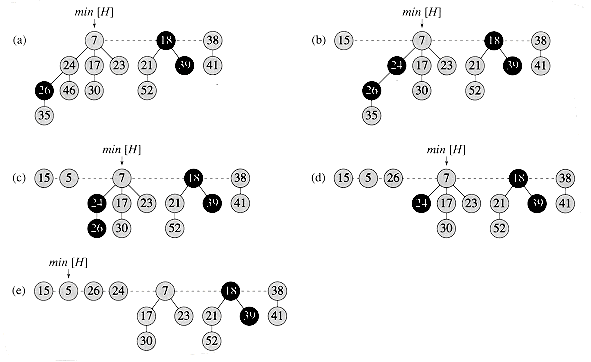 Figure 21.4 Two calls of FIB-HEAP-DECREASE-KEY. (a) The initial Fibonacci heap. (b) The node with key 46 has its key decreased to 15. The node becomes a root, and its parent (with key 24), which had previously been unmarked, becomes marked. (c)-(e) The node with key 35 has its key decreased to 5. In part (c), the node, now with key 5, becomes a root. Its parent, with key 26, is marked, so a cascading cut occurs. The node with key 26 is cut from its parent and made an unmarked root in (d). Another cascading cut occurs, since the node with key 24 is marked as well. This node is cut from its parent and made an unmarked root in part (e). The cascading cuts stop at this point, since the node with key 7 is a root. (Even if this node were not a root, the cascading cuts would stop, since it is unmarked.) The result of the FIB-HEAP-DECREASE-KEY operation is shown in part (e), with min[H] pointing to the new minimum node.