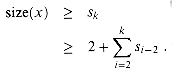 Proof Let sk denote the minimum possible value of size(z) over all nodes z such that degree[z] = k. Trivially, s0 = 1, s1 = 2, and s2 = 3. The number sk is at most size(x). As in Lemma 21.1, let y1, y2, . . . , yk denote the children of x in the order in which they were linked to x. To compute a lower bound on size(x), we count one for x itself and one for the first child y1 (for which size(y1)