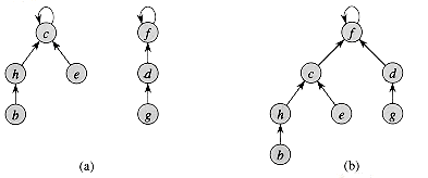 We perform the three disjoint-set operations as follows. A MAKE-SET operation simply creates a tree with just one node. We perform a FIND-SET operation by chasing parent pointers until we find the root of the tree. The nodes visited on this path toward the root constitute the find path. A UNION operation, shown in Figure 22.4(b), causes the root of one tree to point to the root of the other.