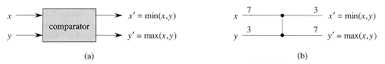 Each comparator produces its output values only when both of its input values are available to it. In Figure 28.2(a), for example, suppose that the sequence