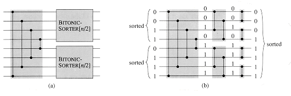 The bitonic sorter that we shall construct is a comparison network that sorts bitonic sequences of 0's and 1's. Exercise 28.3-6 asks you to show that the bitonic sorter can sort bitonic sequences of arbitrary numbers.