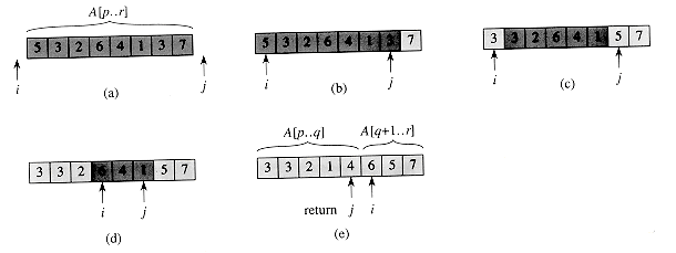 Figure 8.1 shows how PARTITION works. It first selects an element x = A[p] from A[p . . r] as a "pivot" element around which to partition A[p . . r]. It then grows two regions A[p . . i] and A[j . . r] from the top and bottom of A[p . . r], respectively, such that every element in A[p . . i] is less than or equal to x and every element in A[j . . r] is greater than or equal to x. Initially, i = p - 1 and j = r + 1, so the two regions are empty.